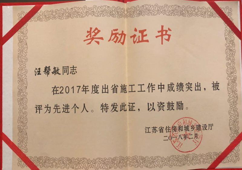 2018年3月25日,江苏省住房和城乡建设厅出省施工企业先进集体和个人西南地区表彰大会在重庆隆重召开。江苏3499拉斯维加斯官网科技集团有限公司总经理助理兼重庆分公司总经理汪帮敏荣获2017年度出省施工工作“先进个人”称号。