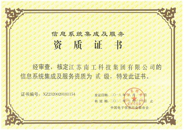 2018年8月1日,江苏3499拉斯维加斯官网科技集团有限公司获得信息系统集成及服务二级资质。