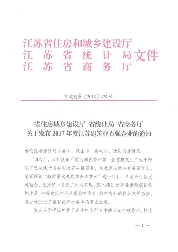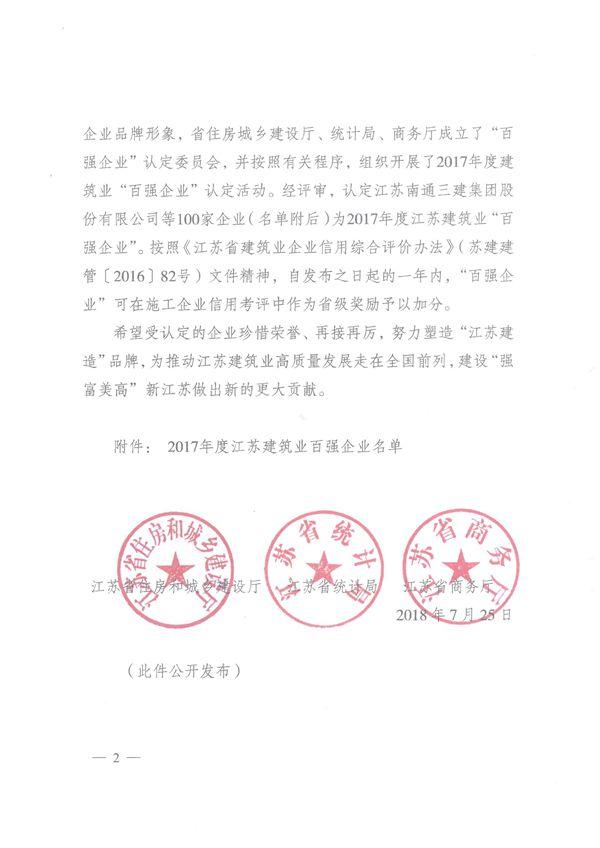 近日,江苏省住房城乡建设厅、江苏省统计局、江苏省商务厅联合发布2017年度全省建筑业“百强企业”名单,江苏3499拉斯维加斯官网科技集团有限公司以出色的成绩荣登百强企业榜单。