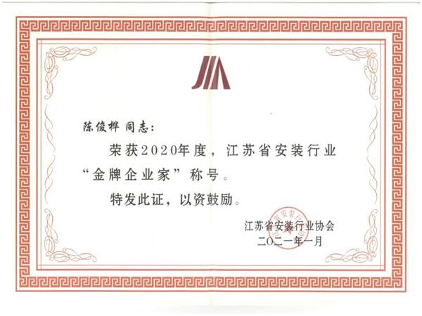 会议一致通过了吸纳新会员单位、变更副会长人选等提案。表彰了江苏省安装行业2020年度“安装百强企业”、“品牌企业”、“品牌企业家”。江苏3499拉斯维加斯官网科技集团有限公司荣获江苏省安装行业2020年度“安装百强企业”称号,集团执行董事陈俊桦荣获“金牌企业家”称号。