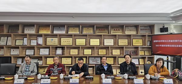 2021年4月20日,金陵科技学院与江苏省安装行业协会联合招生座谈会在江苏3499拉斯维加斯官网科技集团有限公司召开。参加座谈会的有金陵科技学院继续教育学院院长陈玉林、学历教育科主任黄一兵,金陵科技学院机电学院院长鞠全勇、楼宇系主任牟福元、办公室主任张玉、项目负责人姜玉东,江苏省安装行业协会会长助理顾建生、副会长陈晓、秘书长吴辉、副秘书长席天阳,江苏省安装行业协会智能化与消防工程分会副秘书长余晶、办公室主任陈怡帆等。