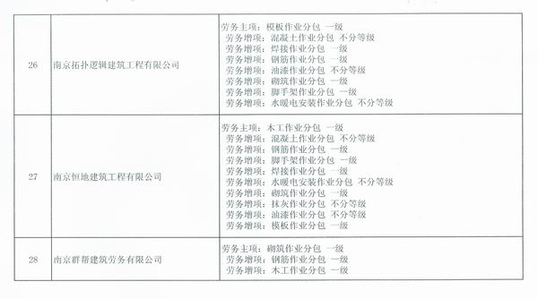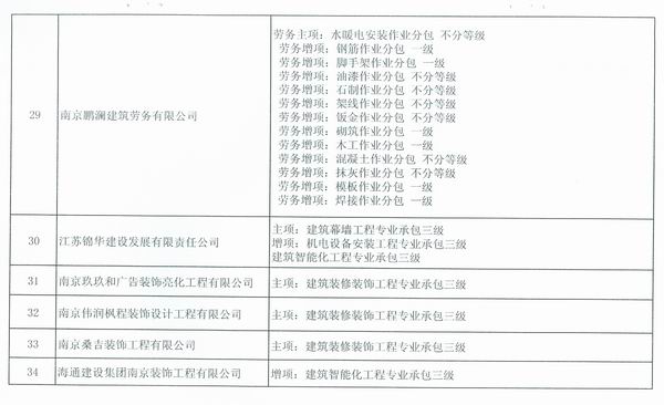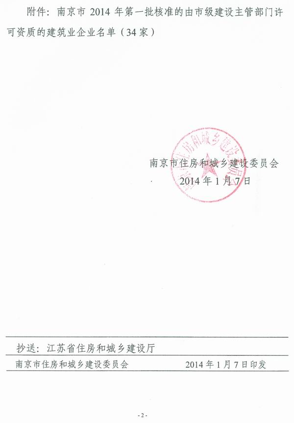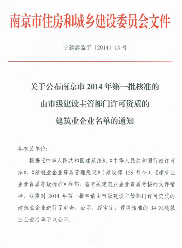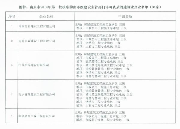 关于公布南京市2014年第一批核准的由市级建设主管部门许可资质的建筑业企业名单的通知