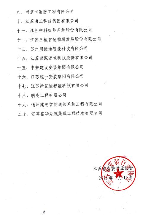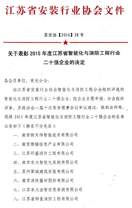 关于表彰2015年度江苏省智能化与消防工程行业二十强企业的决定